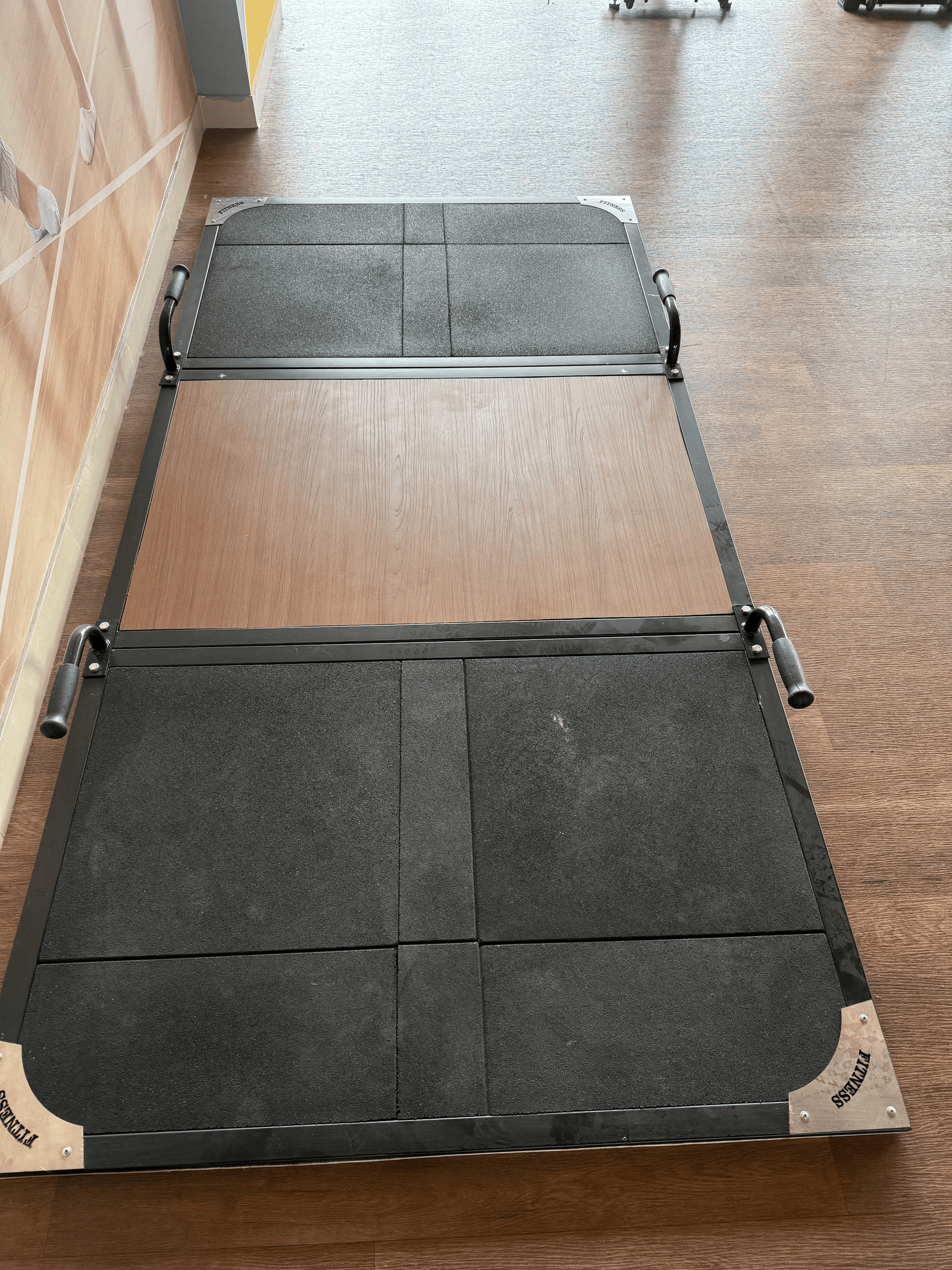 Heavy-duty lifting platform with shock absorption for safe powerlifting.